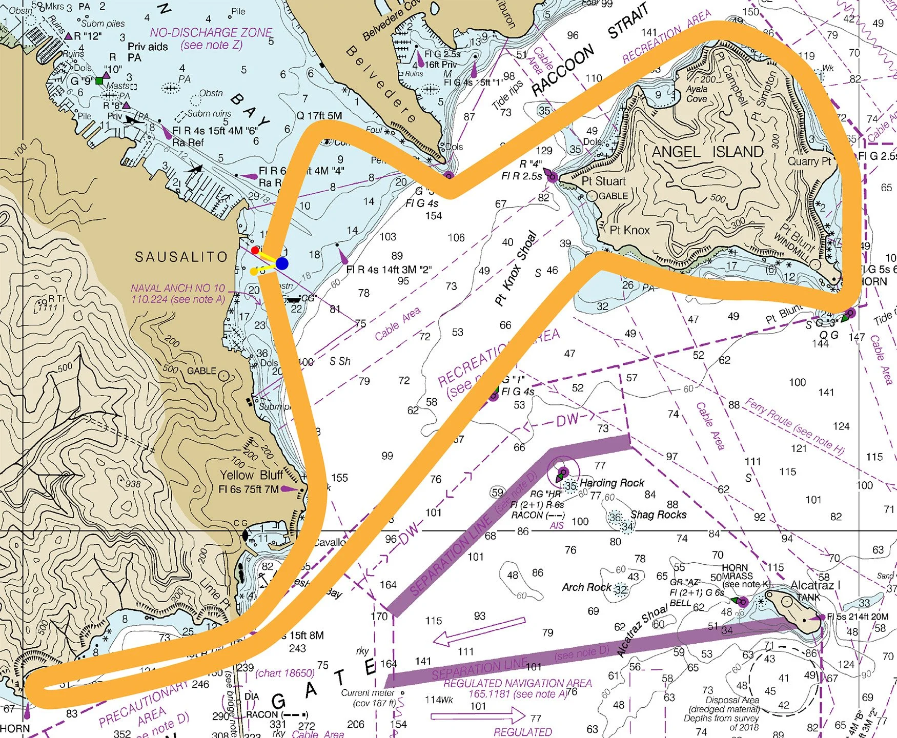 Our classic 15km course that goes out past the Golden Gate Bridge to Pt. Diablo along the Marin shoreline, then turns back in towards the bay for a challenging run in the flood current down to Peninsula Pt. off Belvedere Island.