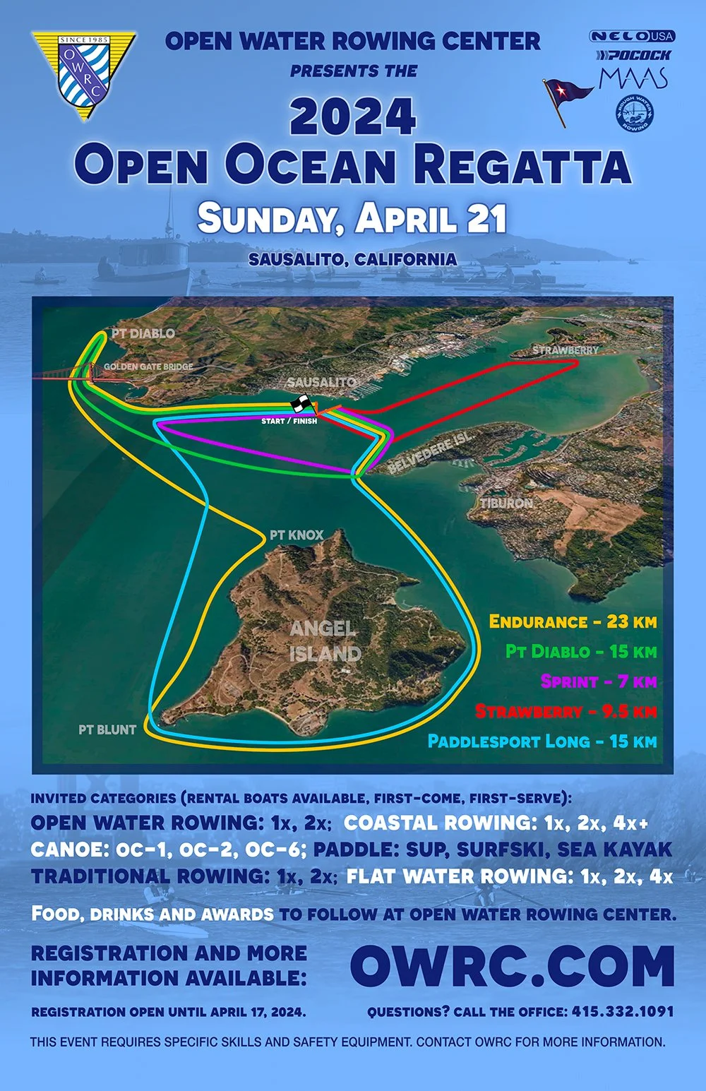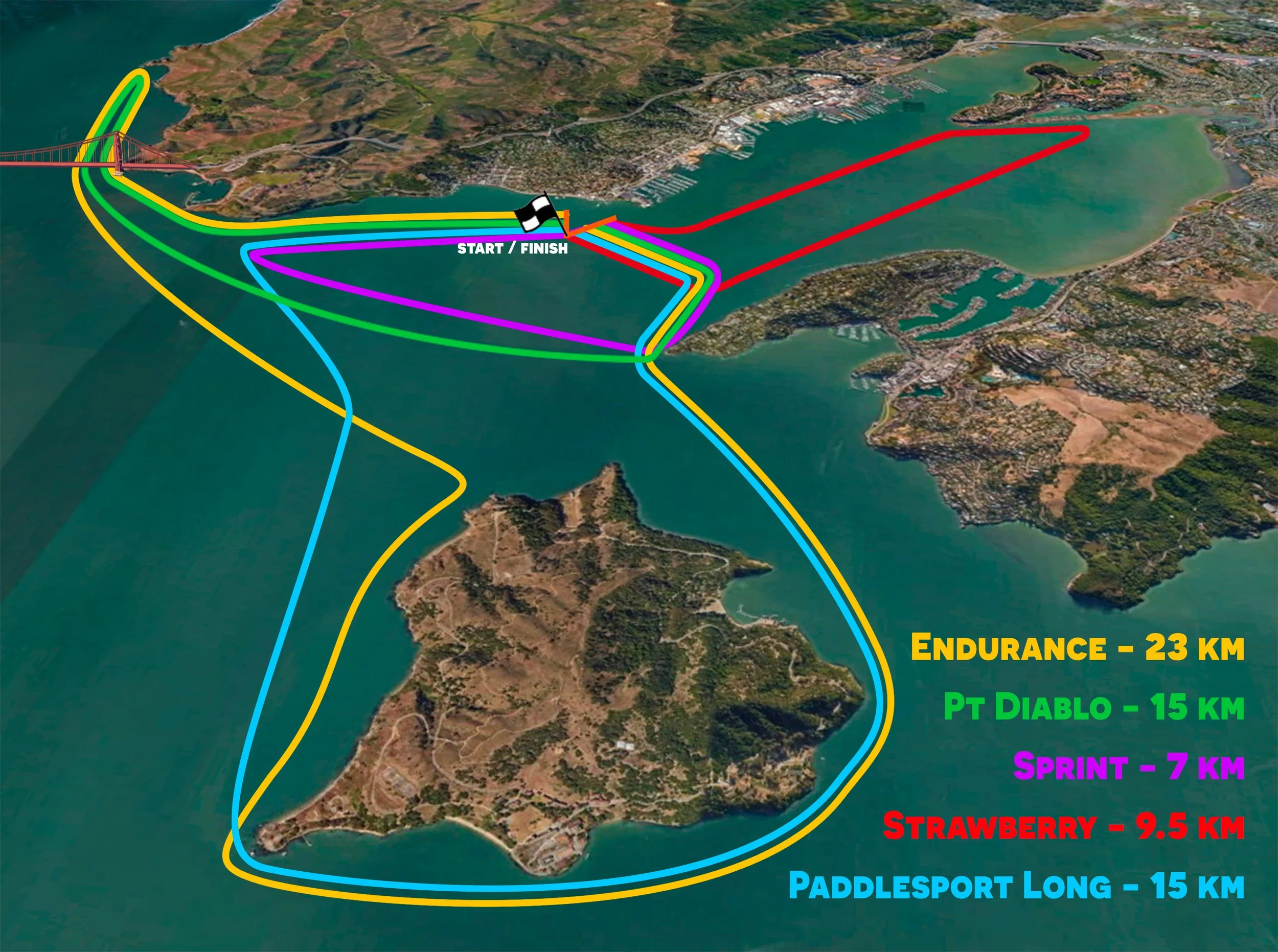The 2024 Open Ocean Regatta features five race courses of different lengths. New this year is the 23km Endurance Course. The shortest Sprint Course, is a distance popular with the Coastal Rowing community: 7km, and will be enjoyed by the SUP community as well. Also new for the SUP, surfski and outrigger canoe communities is the 15km Paddlesport Long Course around Angel Island. The popular Pt. Diablo (15km) and Strawberry (9.5km) courses remain unchanged.